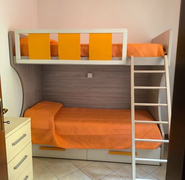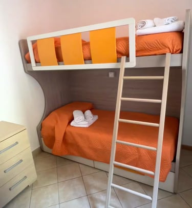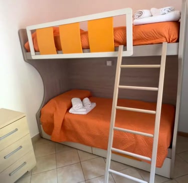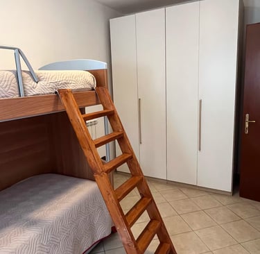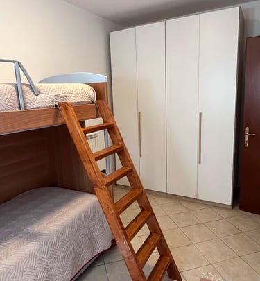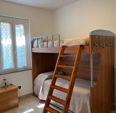 L'appartamento dispone di un letto matrimoniale e altre due camere con letto a castello, cucina attrezzata con fornelli e microonde.